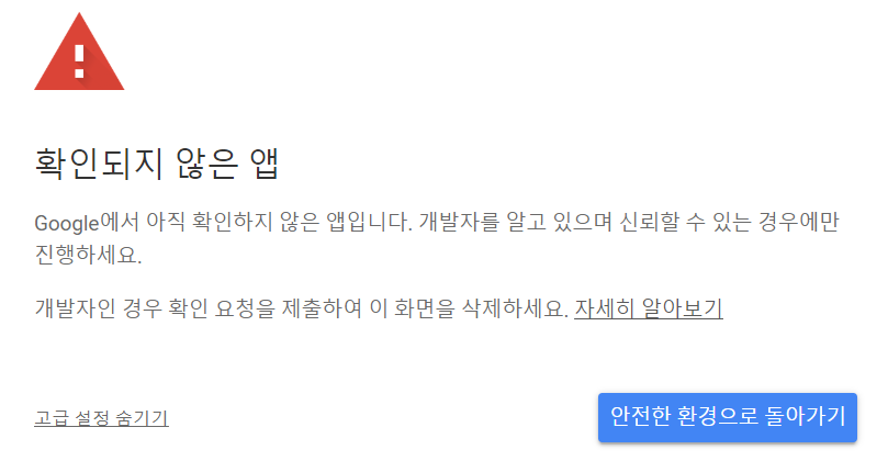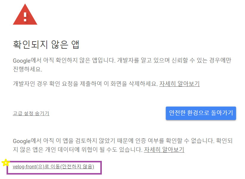 우리는 보통 localhost 에서 개발연습을 하기에 HTTP 에서 테스트를 하게 되고, 여기서 확인되지 않은 앱이라고 나오는것이다.