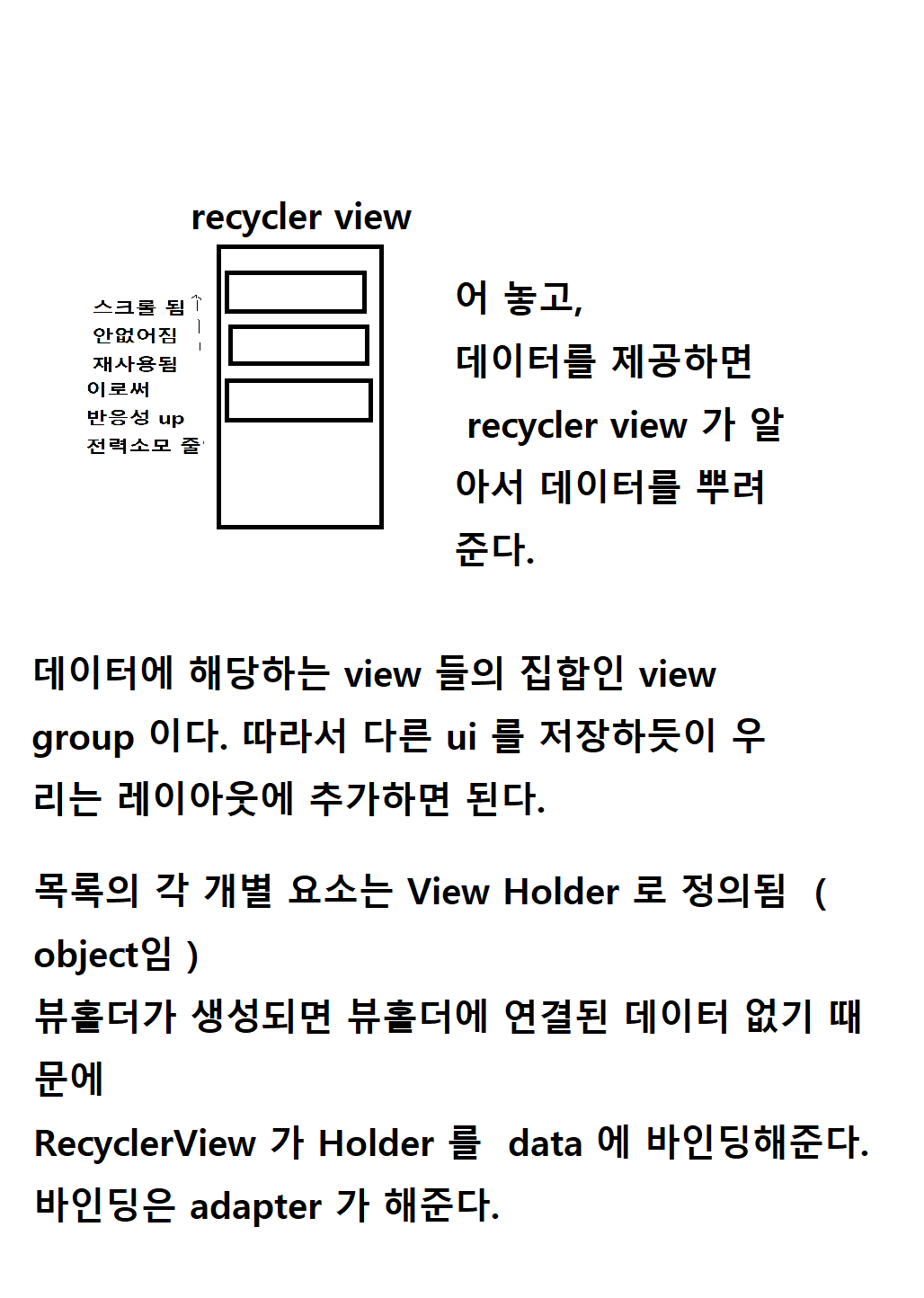 컨테이너 : 화면크기에 필요한 만큼의 홀더를 보유함( 스크롤시 위아래로 어느데이터가 보여야 하는지 ( 데이터바인딩 ) 를 제공함