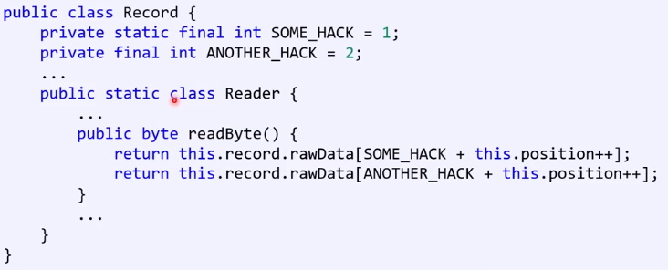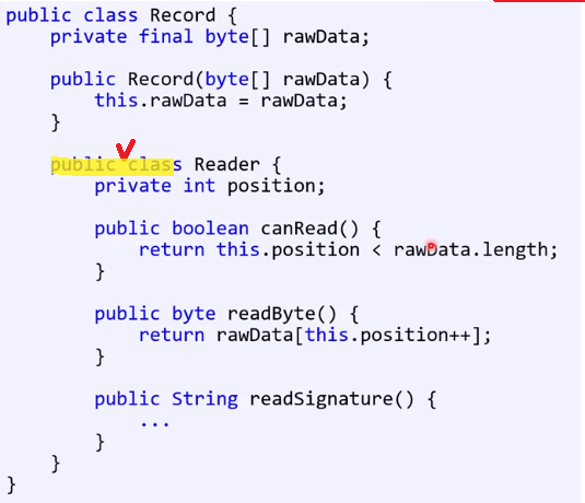 - 다음과 같은 비정적 내포 클래스(Reader)를 생성하려면? (코드로 작성)