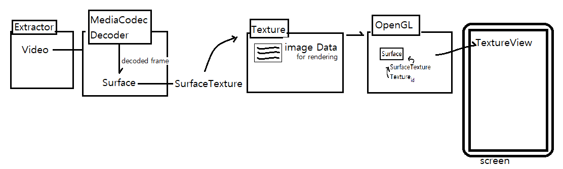 트랙별로 Decoder에 넣어주고, 디코딩된 프레임들을 Surface(랜더링되는 화면)에 넣어준다. Surface는 메모리복사 없이 native 버퍼를 바로 이용할 수 있어 부르더운 렌더링이 가능하다.