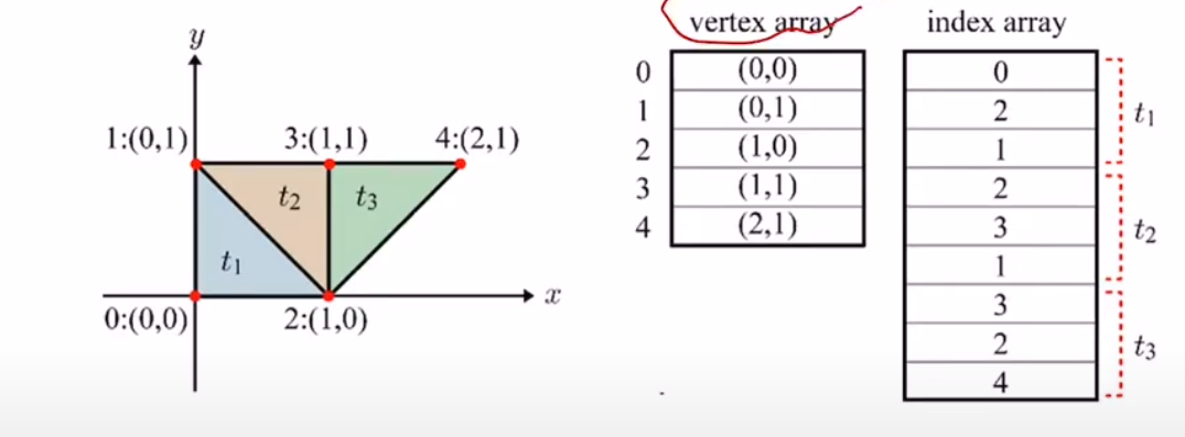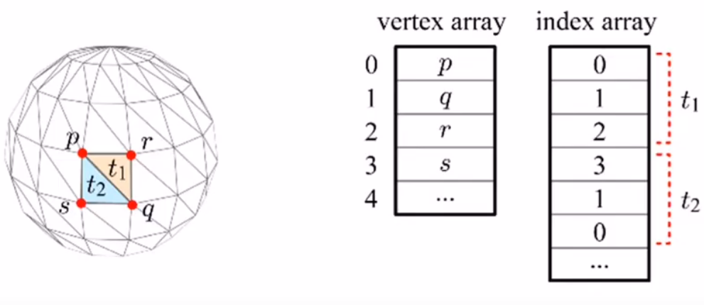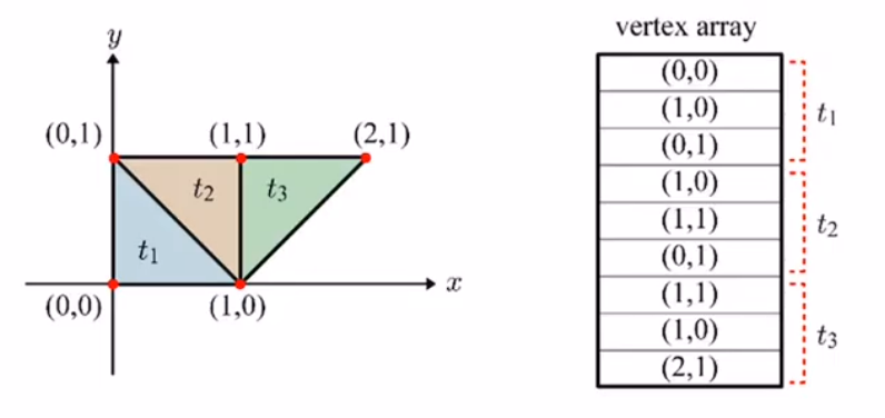 아래는 삼각형 메쉬를 vertex array 로 표현하는 방법을 보여주는 것이다.